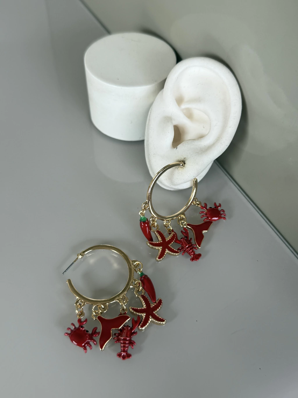 Brinco argola Marina importada dourada pingentes vermelhos lagosta e caranguejo